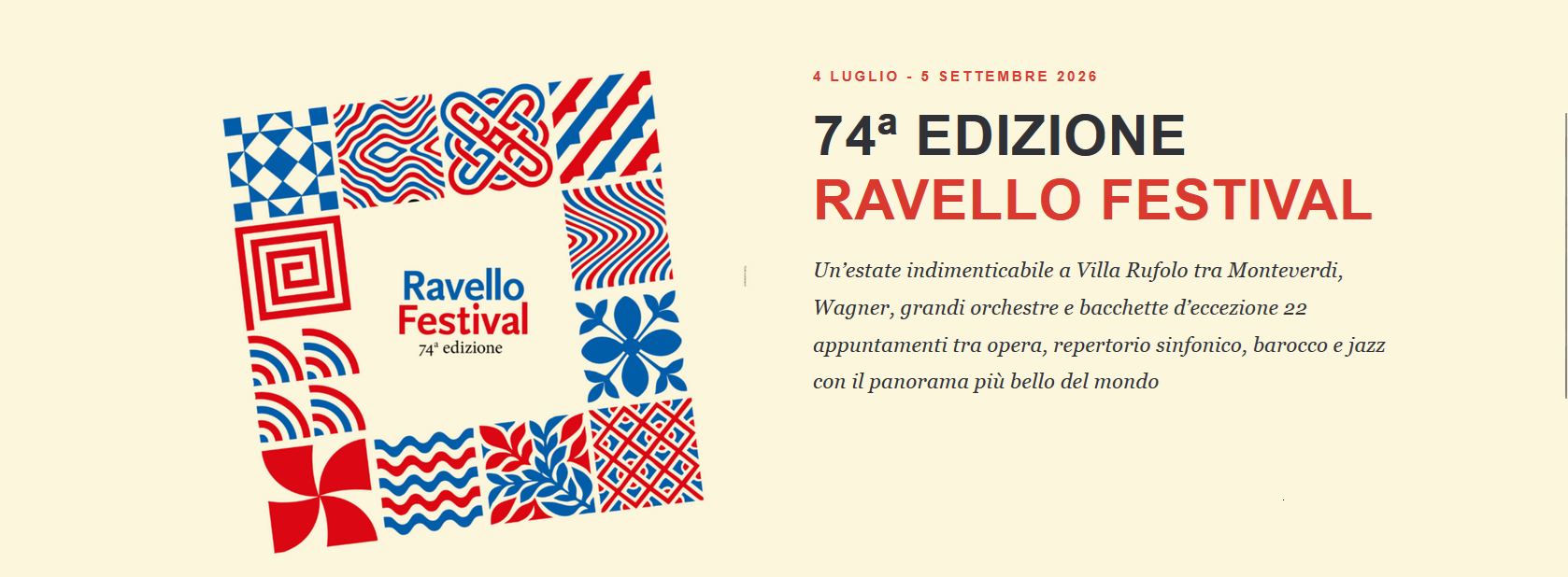18/04/2026 - Si svolgerà a Ravello, presso Villa Rufolo, dal 4 luglio al 5 settembre 2026, la 74a edizione del “Ravello Festival 2026”. La manifestazione, sostenuta dalla Regione Campania, prevede per l’edizione di quest’anno, 22 appuntamenti tra opera, repertorio sinfonico, barocco e jazz, teatro e musica da camera. Le esibizioni, avranno come sfondo naturale, uno dei panorami più belli del mondo