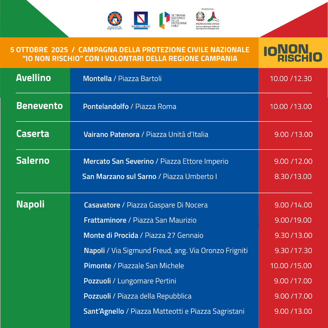 Torna domani, anche in Campania, la campagna della Protezione Civile “Io Non Rischio” dedicata alla diffusione delle buone pratiche per ridurre gli effetti da rischi naturali.
