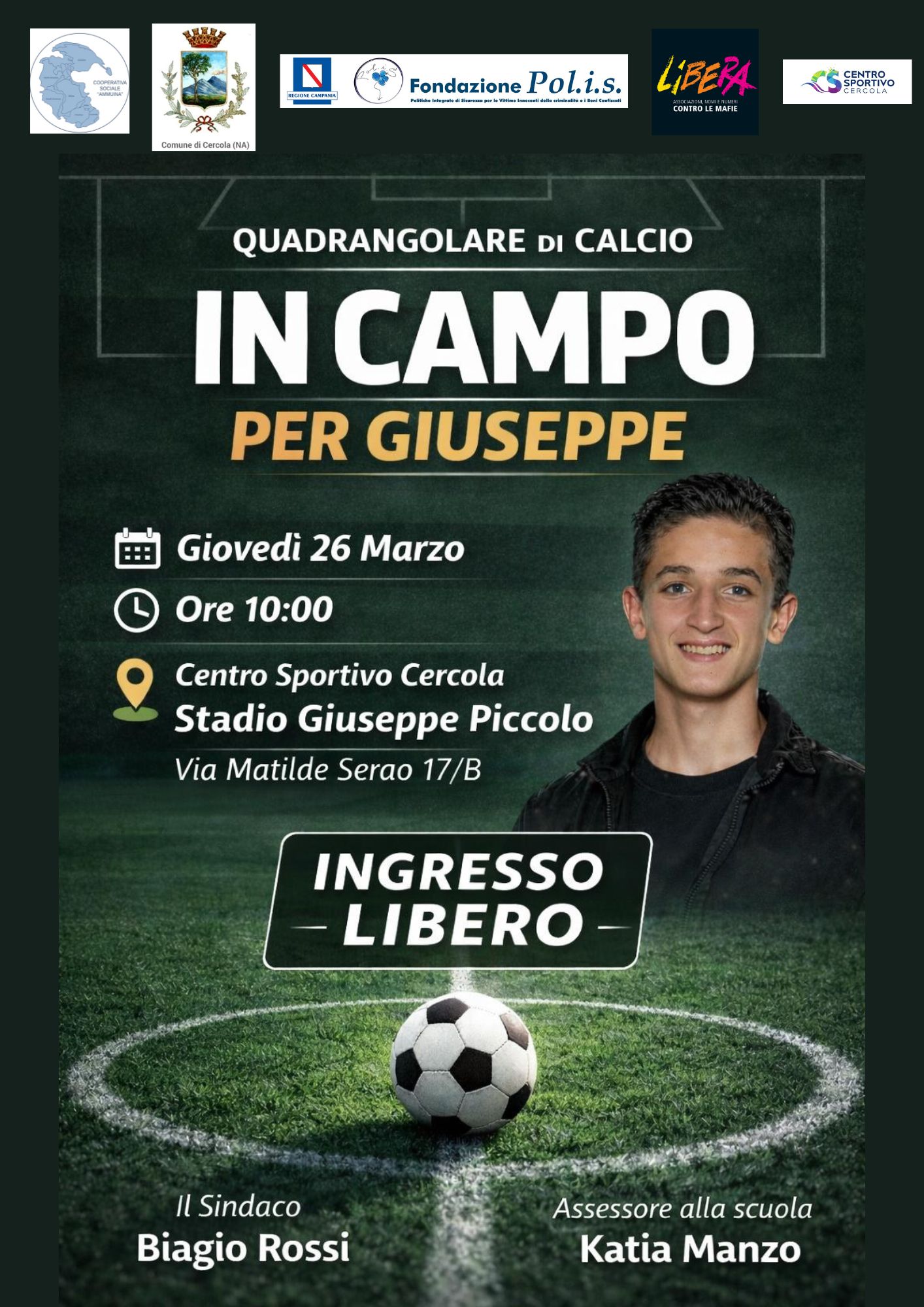 24/03/2026 - Giovedì 26 marzo, alle ore 10:00, presso lo Stadio “Giuseppe Piccolo” di Cercola (via Matilde Serao, 17/B), si terrà un torneo quadrangolare di calcio in ricordo di Giuseppe Piccolo, vittima innocente della camorra, ferito a Cercola, in Piazza Libertà, il 27 marzo del 1991 e morto il 31 marzo successivo.